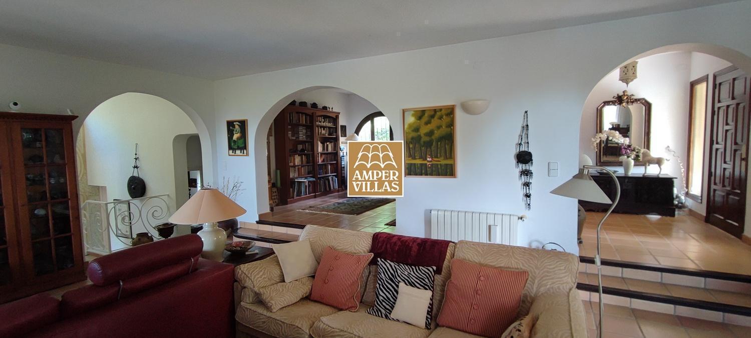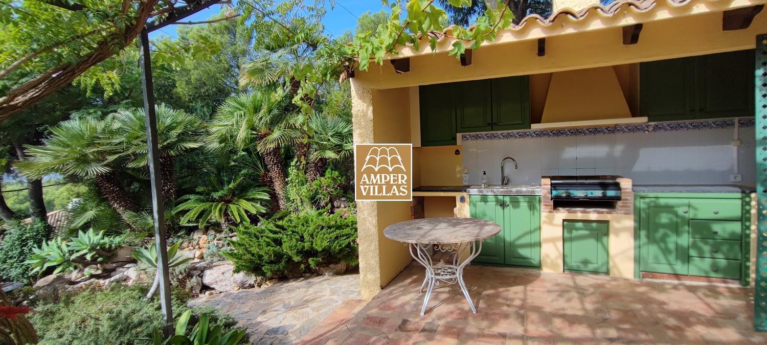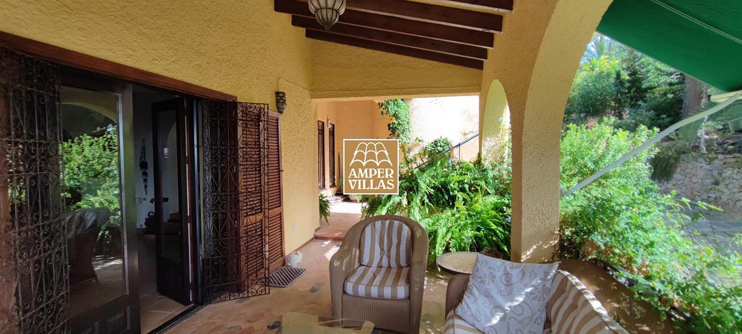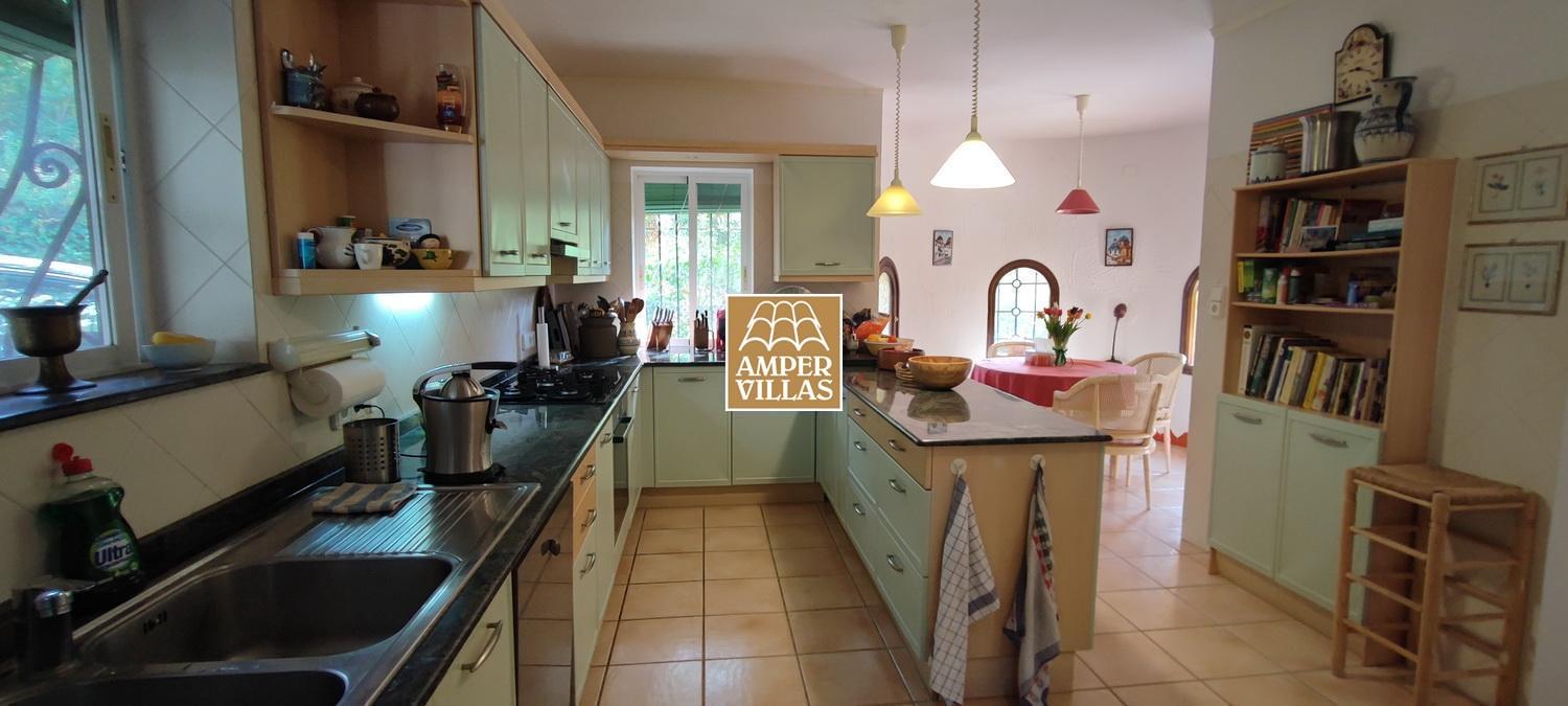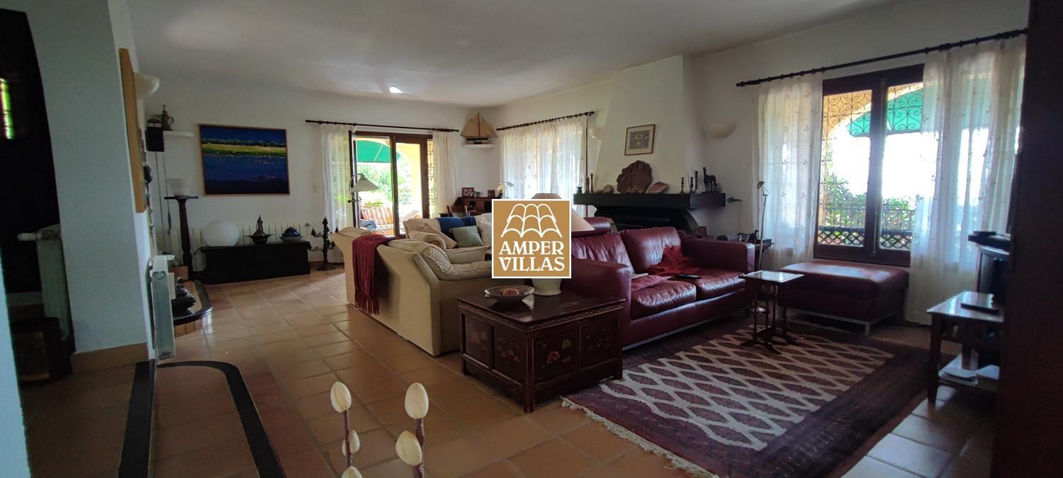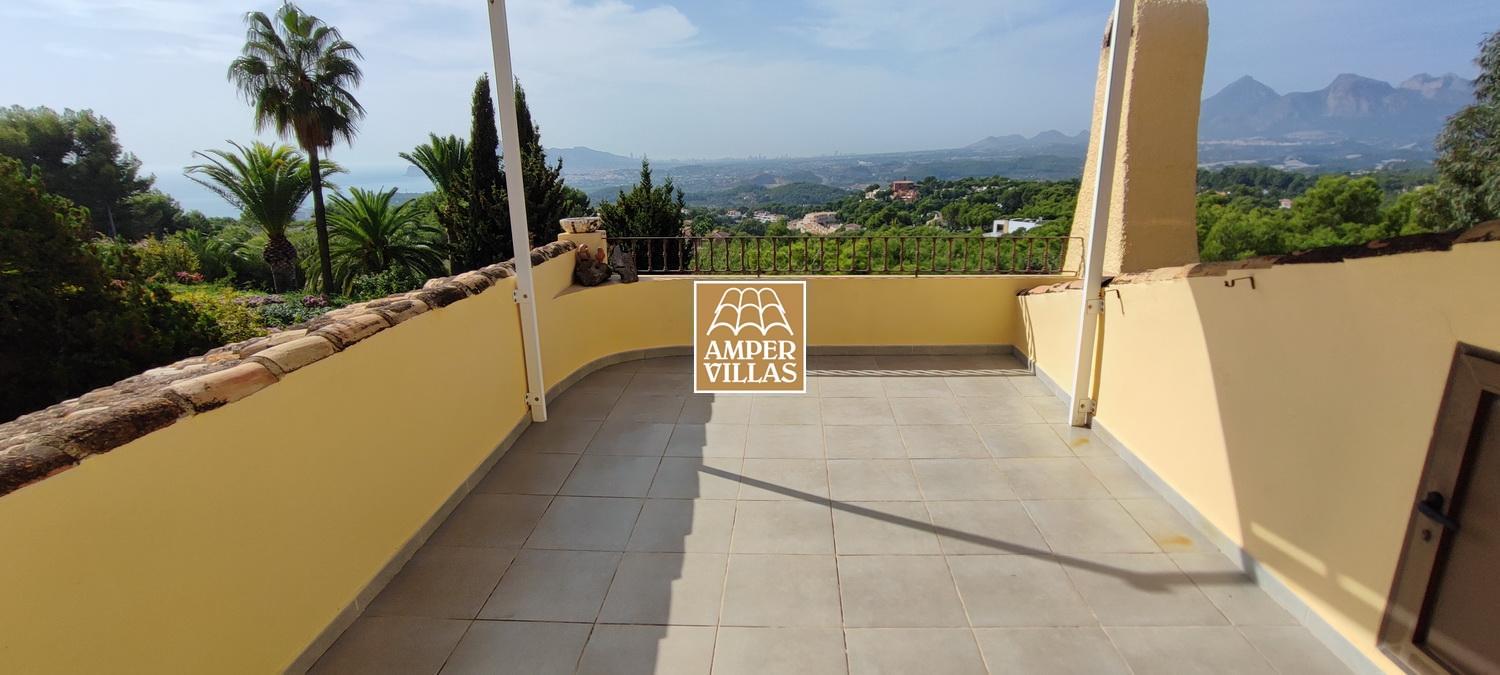 Beautiful Mediterranean villa in the best location of Sierra Altea Golf, with a large plot and an exceptional garden. The distribution is as follows: entrance, large living room with fireplace leading to a beautiful covered terrace, dining room and large kitchen with dining area, 2 bedrooms and 2 bathrooms, one of which is en-suite. On the interior level there is an independent guest apartment with a living-dining room with an open-plan kitchen, 2 bedrooms each with its own bathroom en-suite and access to a terrace where the outdoor kitchen and the pool, surrounded by terraces, are located. On the upper level there is an independent studio with a american kitchen and bathroom and a beautiful terrace with spectacular views of the Bay of Altea and the mountains. Garage and carport, storage room, central heating, south orientation and a lot of privacy.