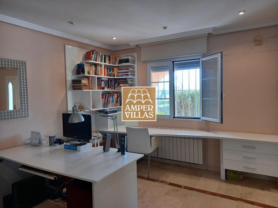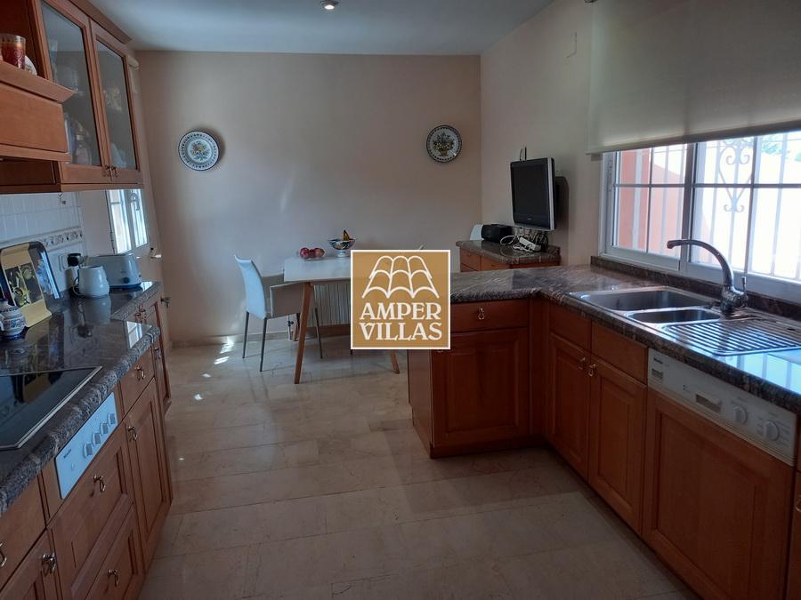Villa in Albir close to all services and the centre, yet in a quiet setting. The house is distributed in 3 bedrooms, 3 bathrooms (1 en suite), a spacious living-dining room, a large fully equipped kitchen with direct access to the terrace. Large garage with capacity for 2 cars, large storage room, laundry room and basement suitable for use as an office, gym, games room or guest room. Gas central heating, air conditioning, solar energy, private pool, solarium with beautiful views and flat plot.