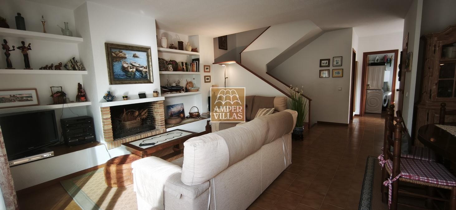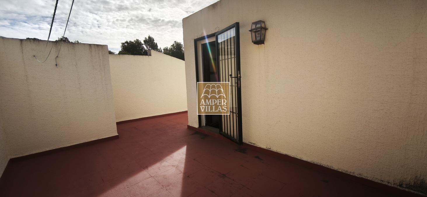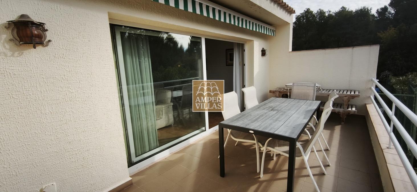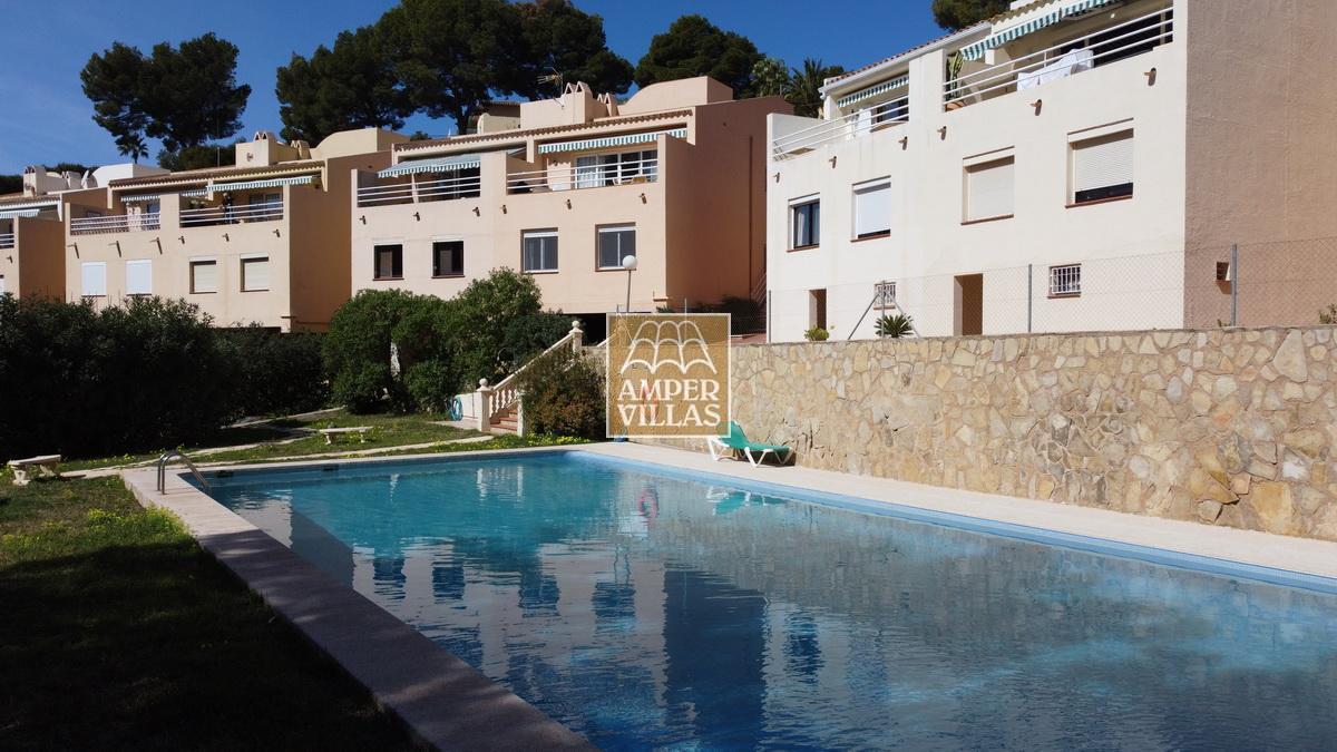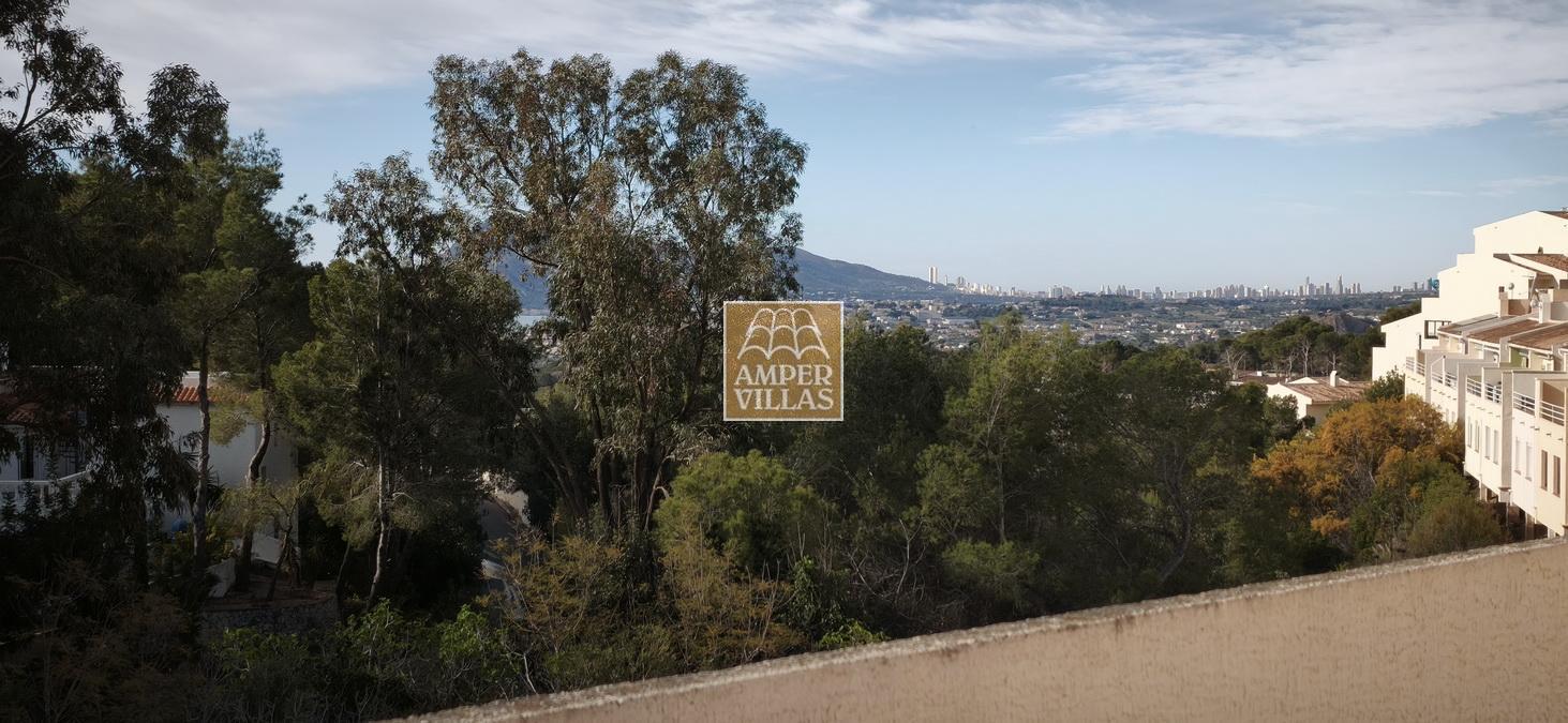 A cosy and spacious corner bungalow, close to the golf club, featuring an entrance hall, a living-dining room opening onto a terrace with lovely views of the greenery, the swimming pool and Altea Bay, a separate kitchen, a guest toilet and a separate utility room. On the ground floor there are 2 bedrooms, 2 bathrooms and a further storage room. On the upper floor there is a sun terrace. The property has hot/cold air conditioning and a fireplace. There is a parking space in front of the house, a communal swimming pool and a tennis court.